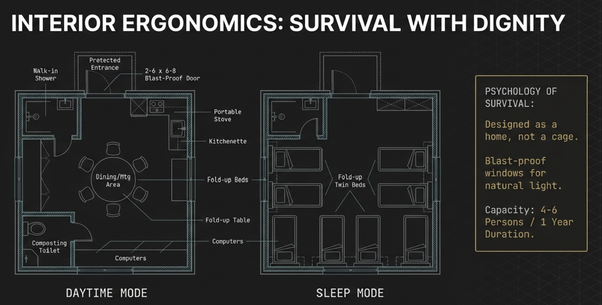 Human-centered design prioritizing habitability, natural light, and psychological well-being for extended duration occupancy